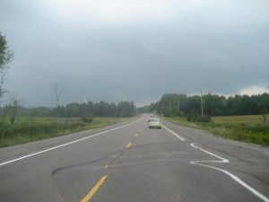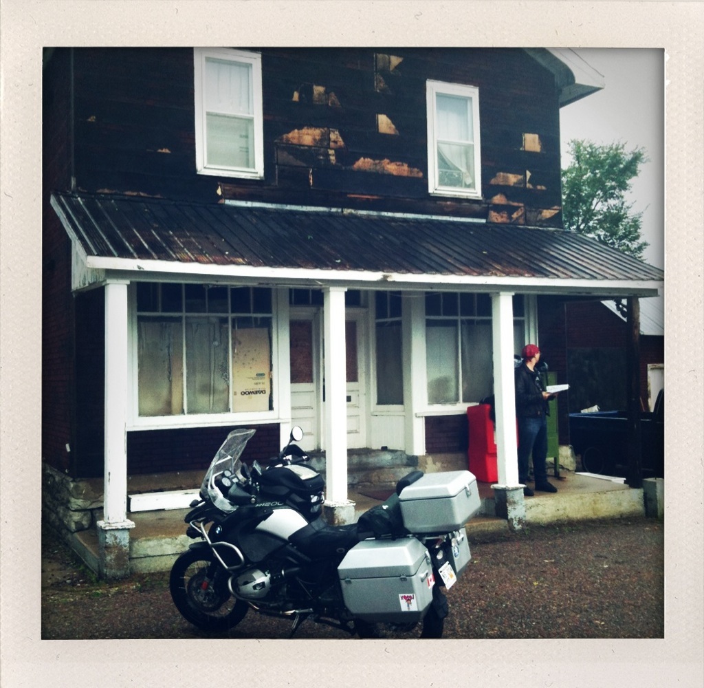 I’ll take their lack of talkativeness as fear, and we just hang. And then the REAL rain and wind comes. We huddle closer like five wet cats as the rain finds its way everywhere. We considered eating the weakest of the group, but just before the sacrifice, the rain eases up, and we breath easier. Then, the Canadian weirdness kicks in. These folks leave, and a Harley guys shows up, and the poor bastard is wearing JEANS! I thought I was in bad shape. Oh man. And his understated quote of the day as he takes off his helmet and wrings his gloves out (or oot as is the custom here), “that shit was biblical man.” Yea. Totally. So we stand for a bit, and we’re both struck by the fact that there are several pick up trucks in the lot that appear to be in action, but there’s no one around. We are in some kind of nomansland. So, I take a moment to go around the the side of the building to throw a wiz. On the house. And wouldn’t you know it, Billy Bob and Jethro show up exactly at that moment in yet another pickup truck full of materials used for god knows what. I look over at my Harley pal, and he’s thinking the same thing. What are the odds of that? We both think we saw movement in the basement, and I’m convinced it was the gimp ensconced in full leather with an eight ball in his mouth. This combined with the toothless, weird looks we get from the boys pretty much gets us moving.