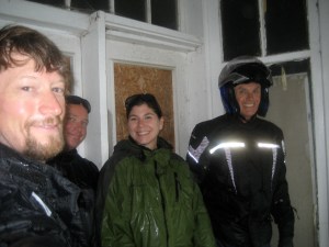 I finally see a structure off in the distance and make a beeline for it. Pulling off, I find four other riders huddling under the overhang.