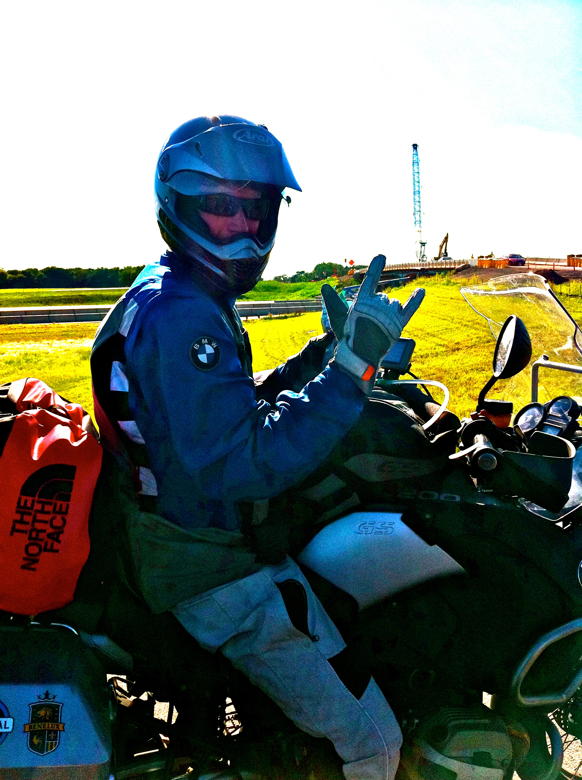 As we left Madison, there wasn’t a cloud in the sky, and the city had that unbridled early morning promise of the green new student untouched by reality and experience. Ah, the bliss of new beginnings. This bliss carried us for about 100 miles until the heat hit. Had we been out for a nice leisurely ride, I wouldn’t have noticed it, but 9 hours of 85 mph+ into a headwind in 85-90 degree weather wore on me. It reminded me of the heat at the Turkish / Russian bathhouse as Boris blasted heat into me with huge palm fronds on the top row of the steam room. Of course, any day you end up drinking vodka with 20 naked Russians at 10 am can’t be all bad, but that’s a story for another time. For now, just think of sticking your face in an oven with a huge fan pushing hot air into your face. I looked like a raccoon at the end of the day. Good look for me – it highlights my German nose, which it does NOT need…