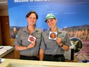 We continued on through the beauty, and made our way along the road. At one point, we were getting a bit tired, so we stopped when we saw a sign that looked like there might be some coffee available. It ended up being a great stop! We ended up at a Park service building and met Isabella and Tanya, the friendly Park Service ladies. We stopped for coffee but instead ended up making friends over tattoos and stickers. They’re no of course big fans of the Milwaukee Grand Cafes and promised to sport our stickers on guitar boxes and cars. I’m wearing my maple leaf with pride.