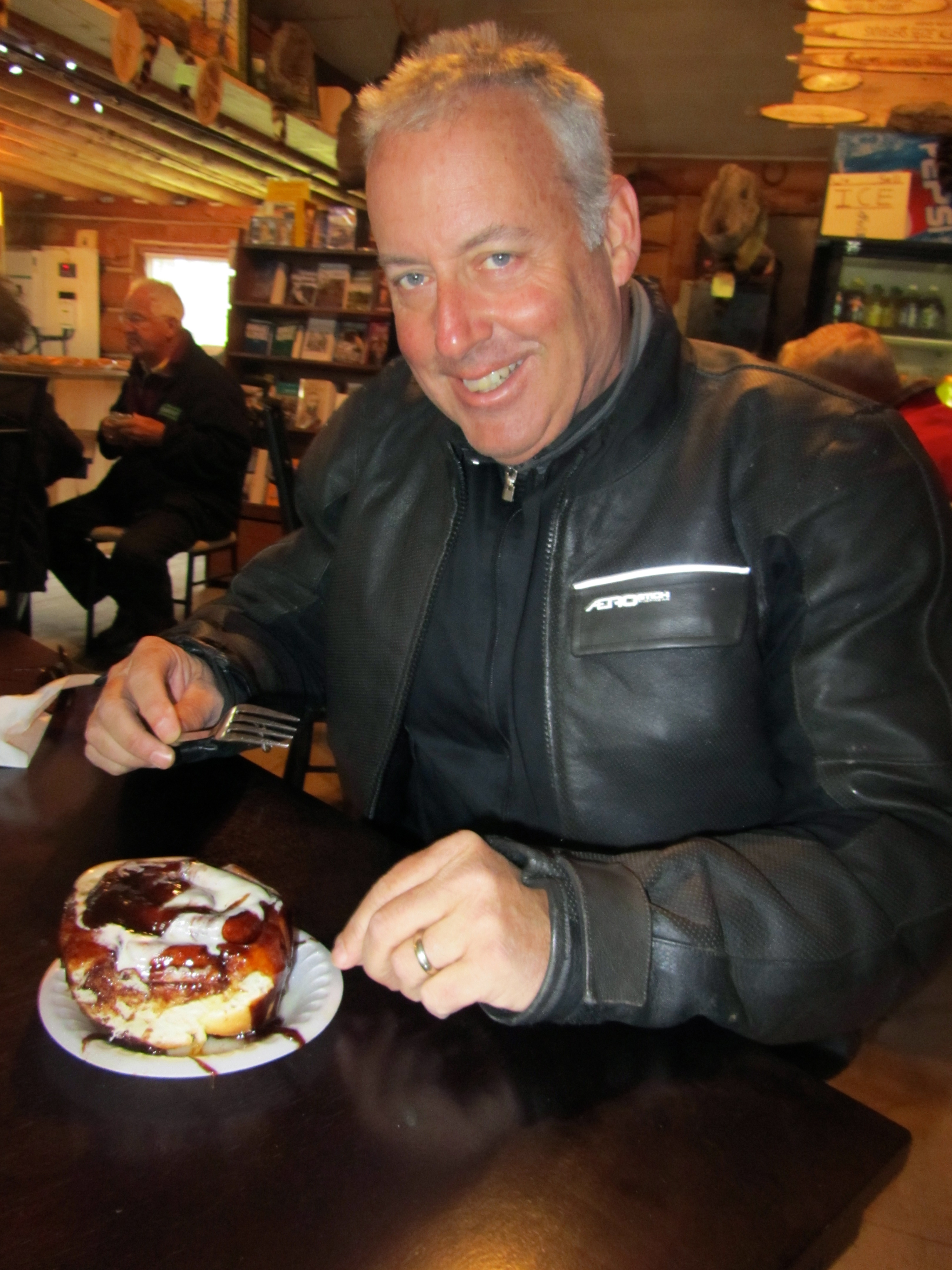 We walk into a dilapidated building surrounded by dilapidated buildings, and we find people sitting around tables.  Waiting for cinnamon buns.  In the middle of nowhere.  Oh yea  So we stop a mountain of a man who looks oddly comfortable in an apron and order one cinnamon bun to split.  He looks at us with disdain and says, “Two strapping young men like yourselves are going to share a cinnamon bun?” Oh shit, if we waffle now, we’ll look like even bigger pussies.  I remember thinking, “just hold your ground Wags. He can smell your fear.” With tails between our legs, we mutter, “Yes sir, one bun please.  Two forks.”  We have just ridden over 3,000 miles on motorcycles to the Yukon, and