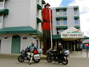 We finally arrived through yet more spectacular riding in Beaver Creek, Yukon. Abut 5 miles as the moose walks (yea, get it?) from Alaska, but about 25 from the border on the road. We settle on the place run by Pakistanis, and for some reason they’re inclined to keep the spartan cafeteria-like dining room at a balmy 87 degrees. And it smells really funny. So, we meander across the street where we then procede to be completely over-served by an evil temptress named Chanty (Shanty? Chandy?). Do NOT be fooled by that smile – just look at my droopy eyes, and you can see she’s proud of her work. I have mentioned the many dangers of the north – you can add this one to the list.