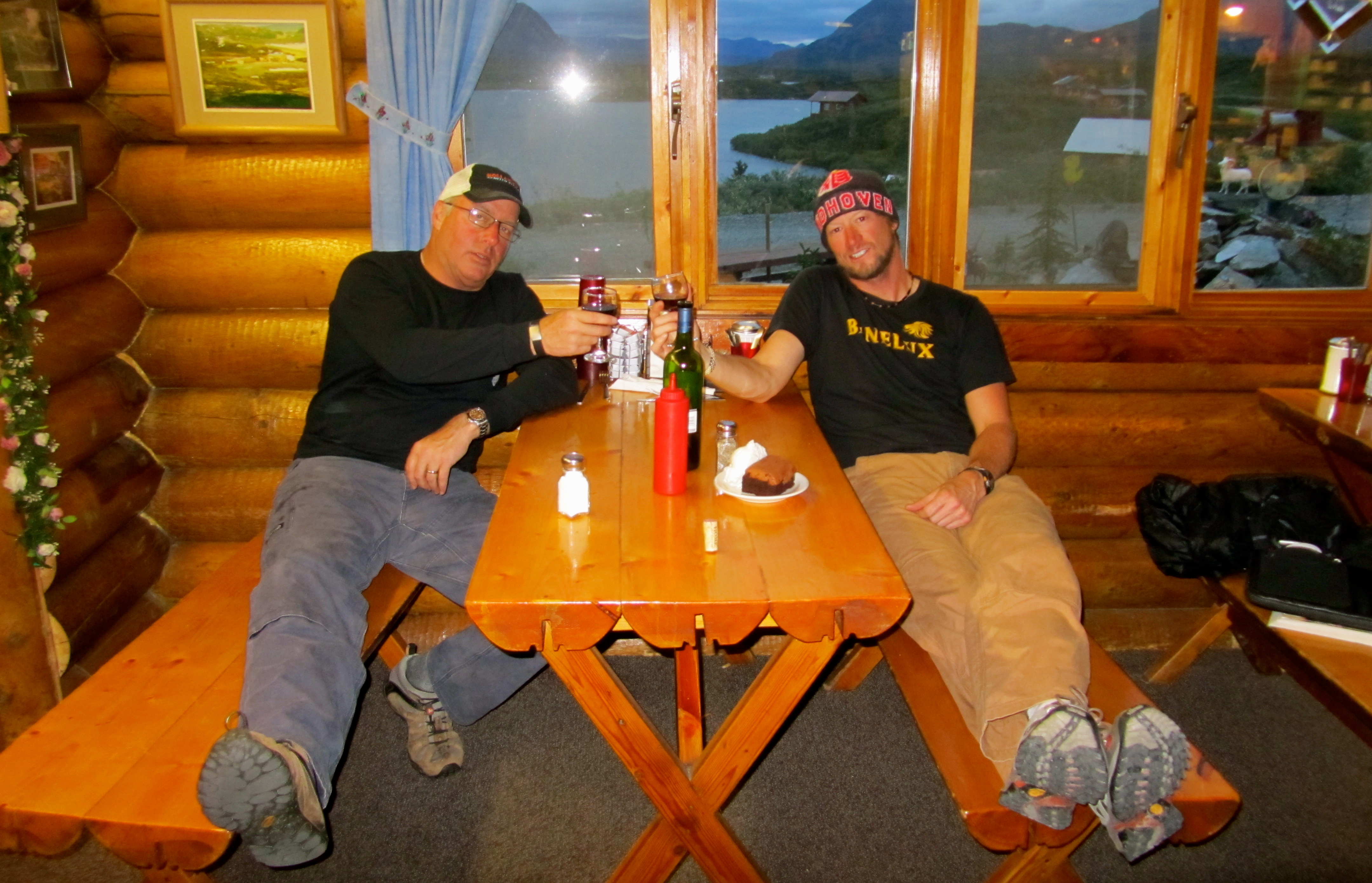 After a while, I finally mellowed out enough to get back on the road.  We passed a lodge called Tangle River Inn when we had about 20 miles to go, and realizing that I could only urge La Gigante to about 20-25 miles an hour, we’d need almost a full hour to get to Paxson, so we decided to stop since it was already 9:30, and the wildlife was clearly on the move.  It’s not smart to ride motorcycles at that time anywhere, and particularly dim-witted in remote Alaska.  It was a great relief when we made the decision, and after arriving in the lodge, I can’t believe we even had to think about it.  I literally could not get my bike to move over 20-25mph – it was as if she was saying, “no Wags, not now.  You need to pull over.  Plenty of time, and plenty of riding tomorrow.  Drink some wine.  I’ll be here in the morning.  Tomorrow I’ll drive.”  After we stopped, I couldn’t believe we’d even considered going on.  She was right – I was done.