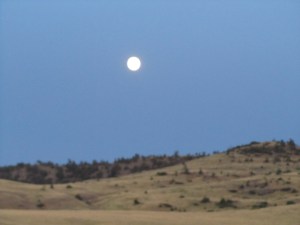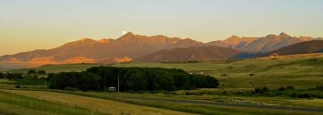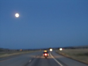 Next was a stop for lunch in Missoula. Seems like a pretty cool town. Good, young, collegie vibe. But, Brad was unfortunately unable to find tires, so the ride to Billings was going to be a fairly slow one. At one point, I was going to go ahead and just meet him in Billings, but then I thought, “Wags, don’t be an ass. You’ll get there all of 20-30 minutes before him. That’s not worth leaving your wingman for. Have you learned nothing? Never leave your wingman.” And, as it turns out, it was all good, and the slow ride was great – we were running from the soft, blue, setting sun and chasing the emerging moon as the sun set in our mirrors the moon rose above the mountains in front of us. And our slow pace gave me the opportunity for some (very safely taken) photos.