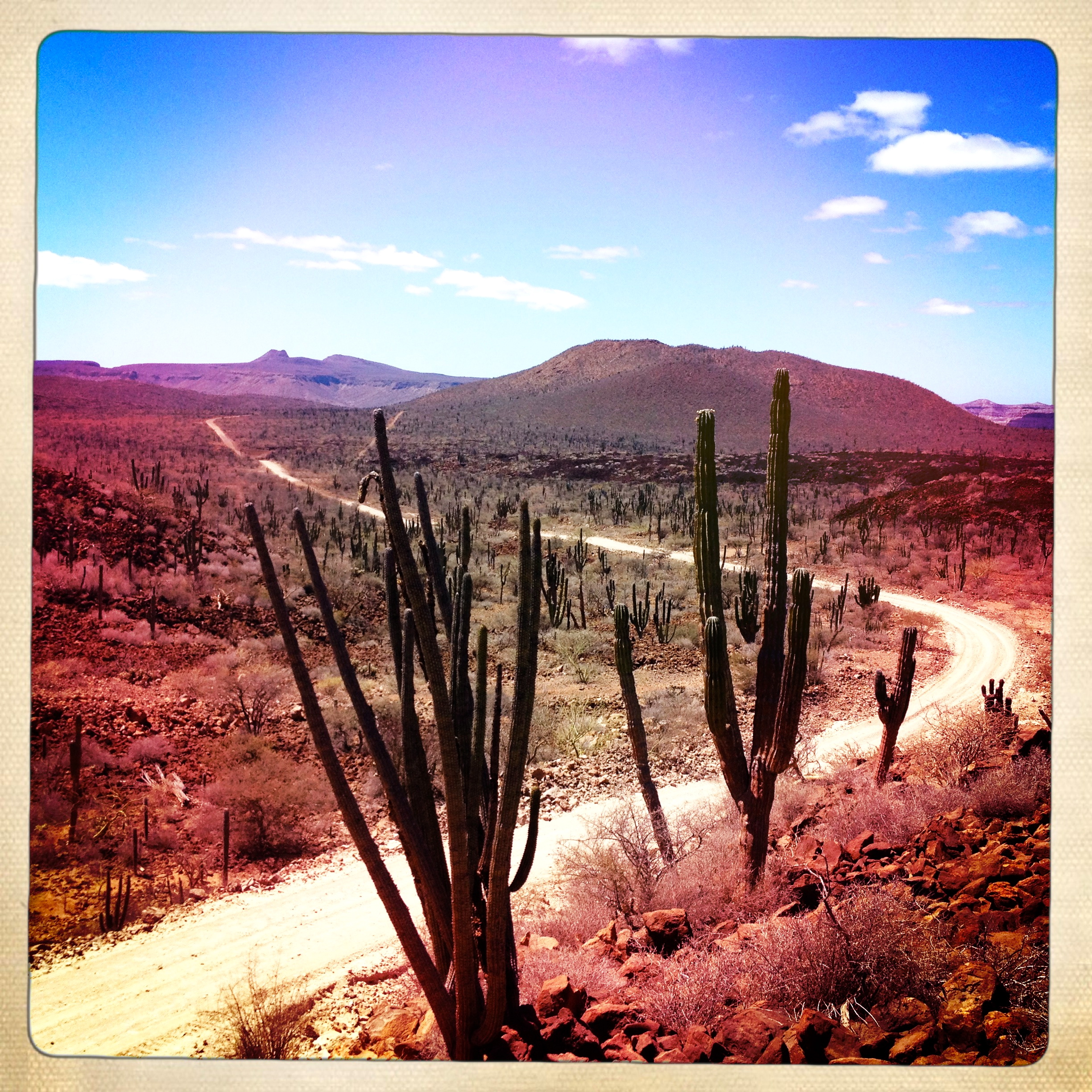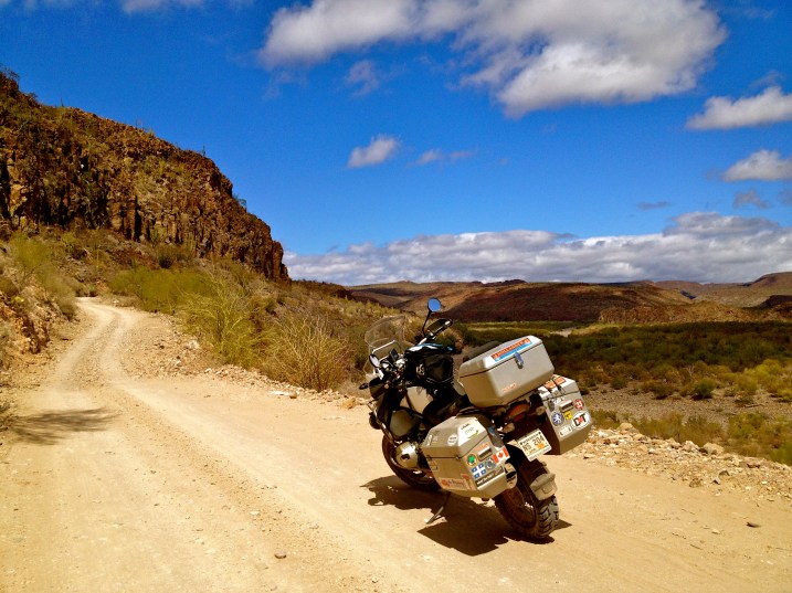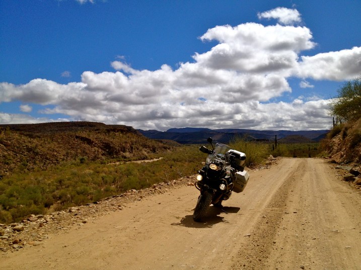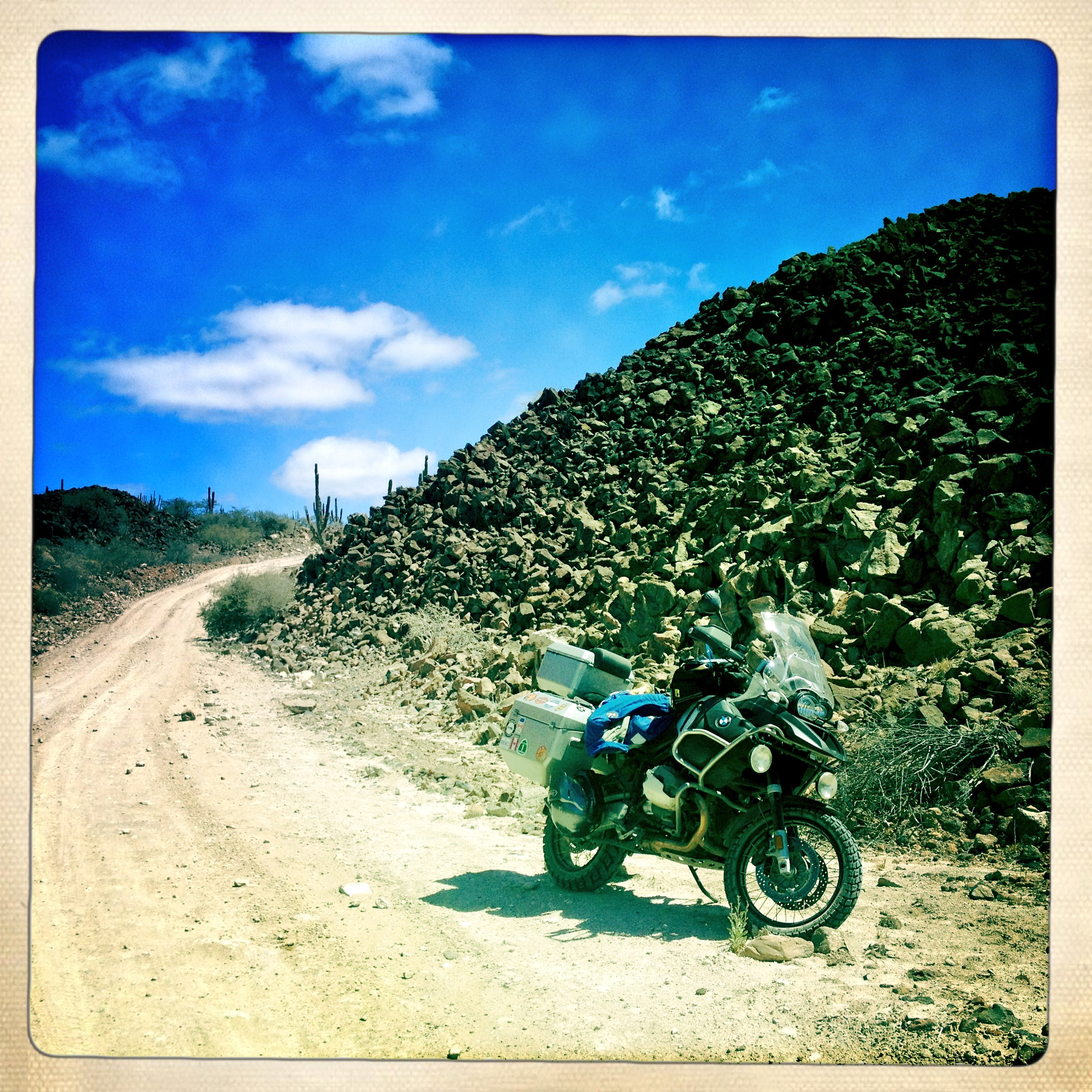 I got up after an astounding night’s sleep (in a good way) thinking I would just have a nice 5-hour ride to La Paz cruising along Hwy 1. Then I looked at the map and found a certain dirt road that would carry me over the mountains and through a little town called La Purisma that I’d never heard of. Why not? I mean, other than the fact that Garmin couldn’t find this road AT ALL, porque no? Garmin would have a hard time finding the ocean from the beach in Mexico…