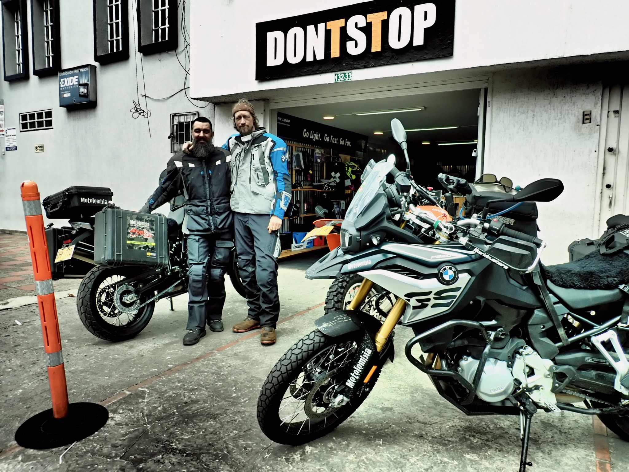 Meanwhile, Gio needed a BMW plug adaptor for his bike. As travel luck would have it, there was a fully equipped moto store WAY better than any of our stores at home literally across the street! We walked over there, and they had the exact part Gio needed. Keep in mind we’re in Bogota. Then the guy from Wonderlicht (a BMW moto parts supplier, which of course happens to be next door to Don’t Stop) knows where the Garmin store is, and they might have the map. And get this, it’s like 10 minutes away – NOTHING in Bogota is ten minutes away. We start to head there to get our map.