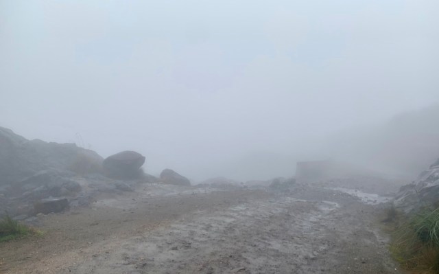 Fog, what fog? I don’t see any fog. He’s taking this photograph with is nose because it’s so cold and wet he can’t take his gloves off.